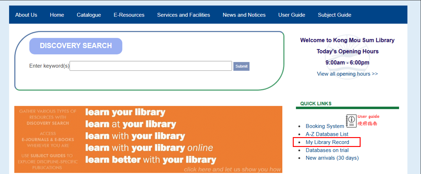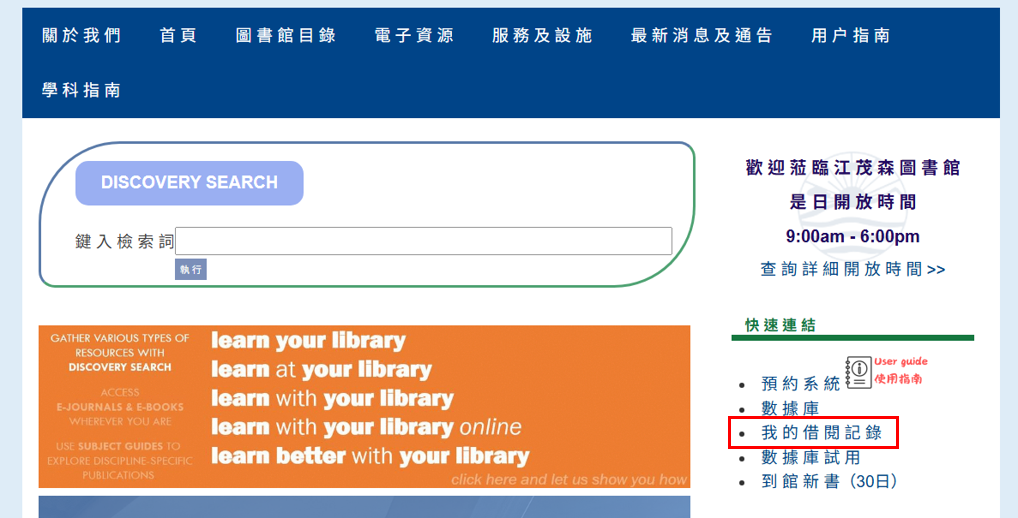 1. Click "My Library Record" under "Quick links" on the library homepage. 進入圖書館主頁後,點擊 “快速連結” 的 “我的借閲記錄”。