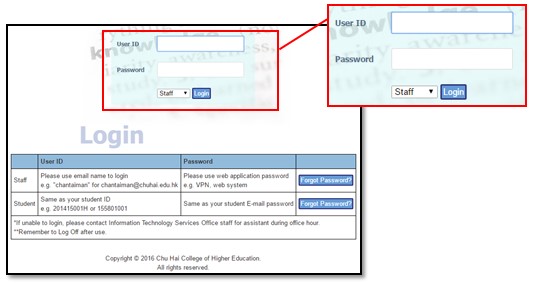 2. Enter your User ID and Password according to the instruction shown, then click "Login". 根據提示輸入你的用戶ID和密碼,然後按 "Login"。