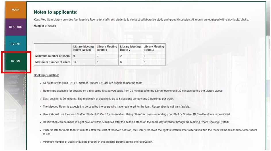 1. 在登入預約系統後,點擊左側“Room”按鍵